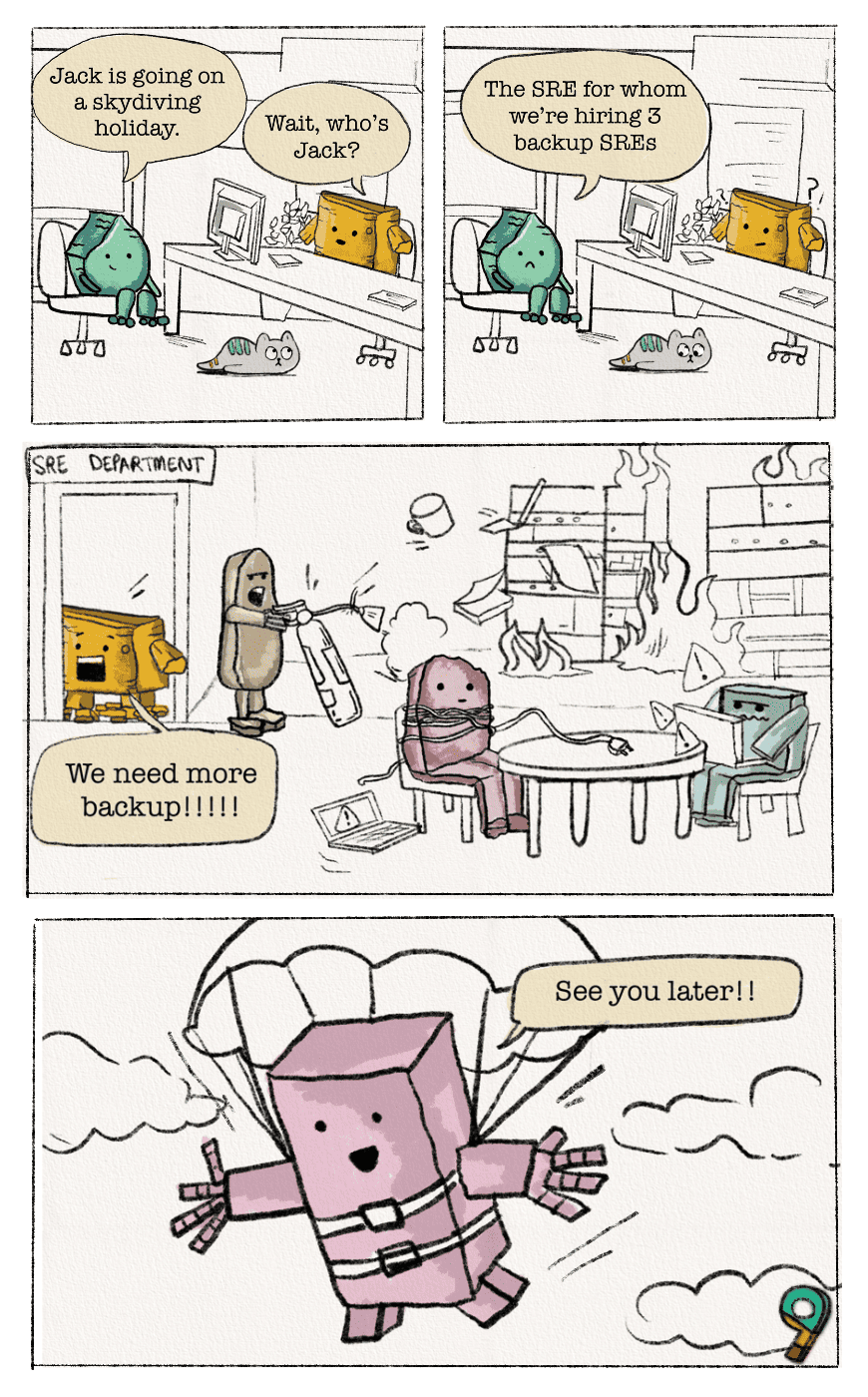 No one knows the SRE person until he goes on a skydiving holiday. Can’t send an SRE sky diving unless we hire 3 backup SREs