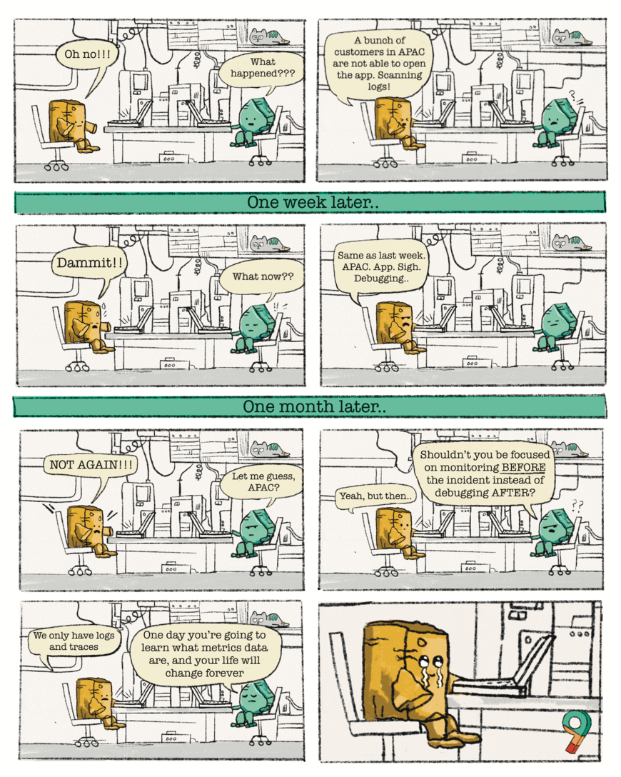 Tired of yelling this out loud: Metrics for immediate action. Logs, Traces and yada yada for debugging in leisure.